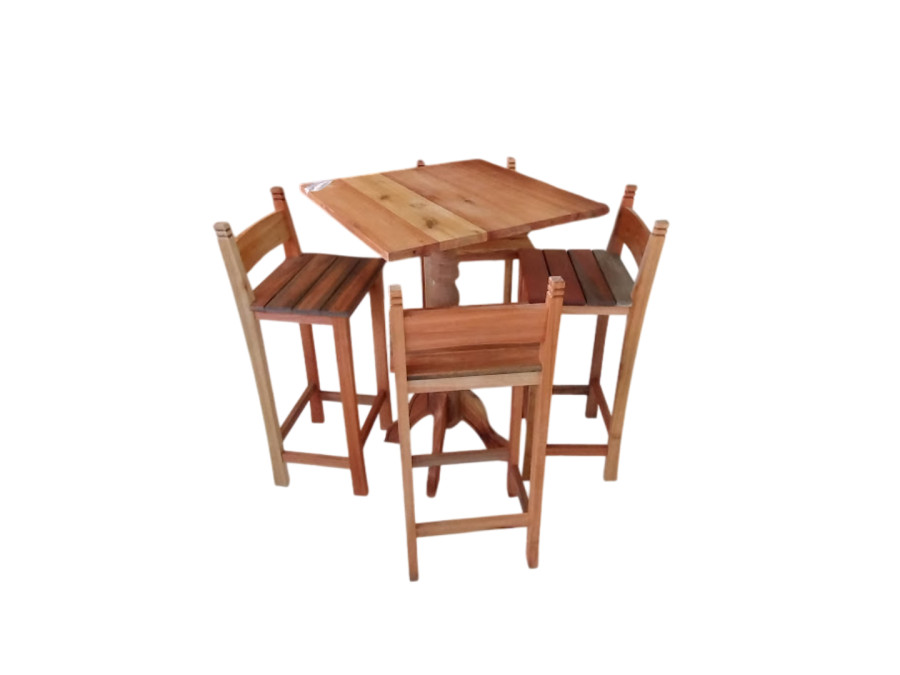 Conjunto composto por uma mesa e quatro banquetas. As cadeiras e mesa são produzidas com madeira de eucalipto. A mesa possui 70 centímetros de largura, 70 centímetros de comprimento e 1 metro de altura.As imagens foram feitas a partir de amostras, portanto as peças podem apresentar alterações de cor e textura. Não há filtro nas fotografias. A madeira de pinus tratado contém nó. Produto em estoque e pronto para retirada após confirmação de pagamento. Fabricação própria * Pagamentos com cartão de crédito estão sujeitos a juros de parcelamento.