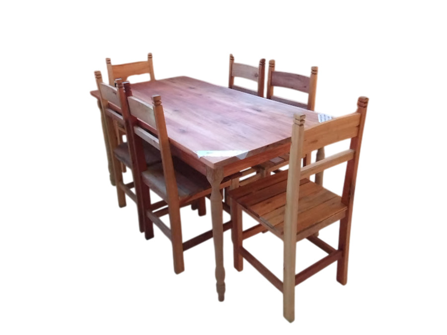 Conjunto composto por uma mesa e seis cadeiras. As cadeiras e mesa são produzidas com madeira de eucalipto. As medidas são, largura, comprimento e atura. A mesa possui 83 centímetros de largura e 1 metro e 60 centímetros de comprimento e 78 centímetros de altura.As imagens foram feitas a partir de amostras, portanto as peças podem apresentar alterações de cor e textura. Não há filtro nas fotografias. A madeira de pinus tratado contém nó. Produto em estoque e pronto para retirada após confirmação de pagamento. Fabricação própria * Pagamentos com cartão de crédito estão sujeitos a juros de parcelamento.