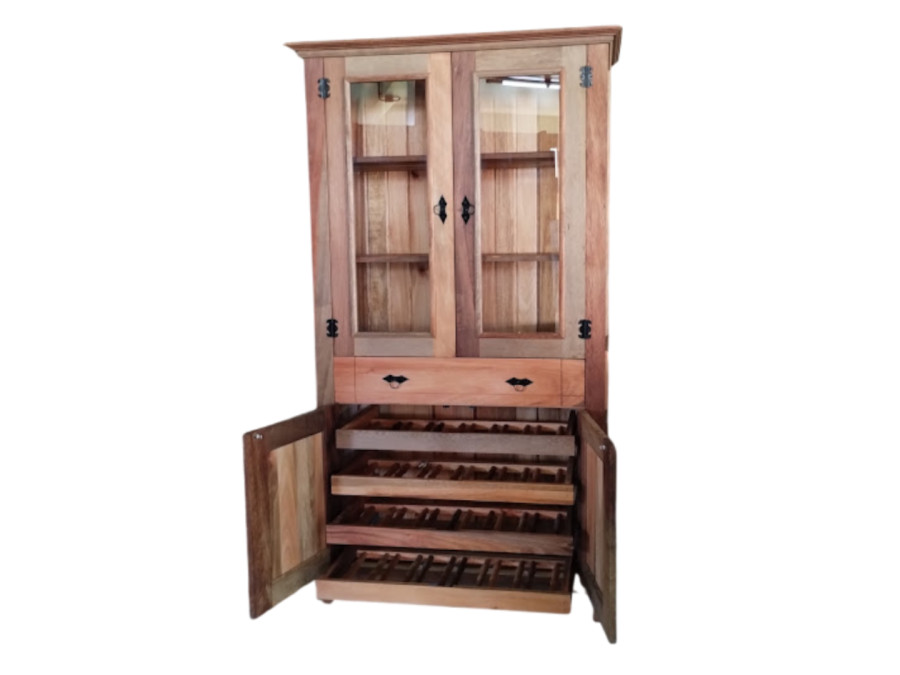 Adega com suporte para taças, adega de vinhos e gaveta com vidros nas laterais. É produzida com madeira de eucalipto e madeira de cedrinho mesclado. Possui 40 centímetros de largura, 1 metro de comprimento e 1 metros e 95 centímetros de atura.As imagens foram feitas a partir de amostras, portanto as peças podem apresentar alterações de cor e textura. Não há filtro nas fotografias. A madeira de pinus tratado contém nó. Produto em estoque e pronto para retirada após confirmação de pagamento. Fabricação própria. * Pagamentos com cartão de crédito estão sujeitos a juros de parcelamento.